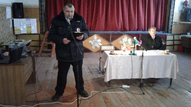 С отчетом об оперативной обстановке на территории поселения за 2016 год выступил старший участковый уполномоченный полиции, майор полиции Владимир Анохин, призвал жителей оказывать содействие отделу полиции в раскрытии преступлений и поблагодарил за оказываемую помощь в охране общественного порядка представителя МКД А.А. Косова.