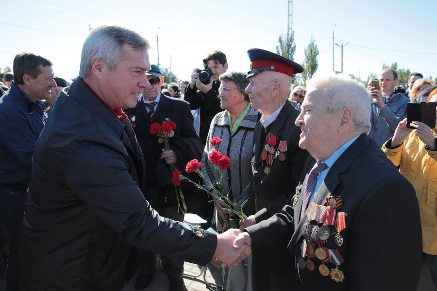 Губернатор и председатель ростовского областного комитета ветеранов войны и Вооруженных сил Сергей Алексеевич Сырцов поприветствовали всех, кто приехал посадить деревья, и открыли памятный камень в честь закладки сада Победы.