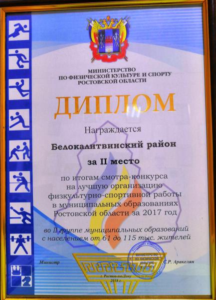 В рамках коллегии были подведены итоги работы муниципалитетов за 2017 год. Белокалитвинский район награжден Дипломом министерства по физической культуре и спорту Ростовской области за II место на лучшую организацию физкультурно-спортивной работы в муниципальных образованиях Ростовской области. Муниципальная детско-юношеская спортивная школа № 2 заняла III место смотра-конкурса на лучшую постановку работы по подготовке спортивного резерва среди муниципальных спортивных школ Ростовской области.
