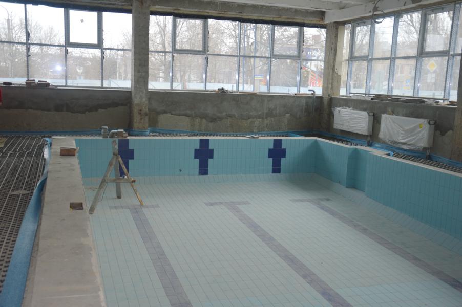 Глава Администрации района Ольга Мельникова и министр по физической культуре и спорту Ростовской области Самвел Аракелян встретились с подрядчиком и обсудили, как продвигаются работы на объекте. Он сообщил, что в прошлом году были произведены демонтажные работы внутри и снаружи здания, залив монолитных участков по всему зданию для вентиляционных шахт и укрепления перекрытий. Однако, в ходе проведения демонтажа были выявлены непредвиденные работы по ремонту и усилению несущих конструкций. В связи с этим возникла потребность в выполнении дополнительных мероприятий, что повлекло к увеличению срока завершения строительства объекта. В настоящее время произведена кирпичная кладка внутри здания, подведены и установлены все инженерные сети, в том числе водоснабжение, отопление, электроэнергия, система канализации и водоочистные системы для обоих бассейнов; завершается установка вентиляционной системы. Завершается отделка фасада, полным ходом ведутся отделочные работы в спортивных залах, душевых комнатах, раздевалках, внутренних помещениях, бассейны облицованы плиткой, установлены межкомнатные двери, а также напольное покрытие в легкоатлетическом манеже.