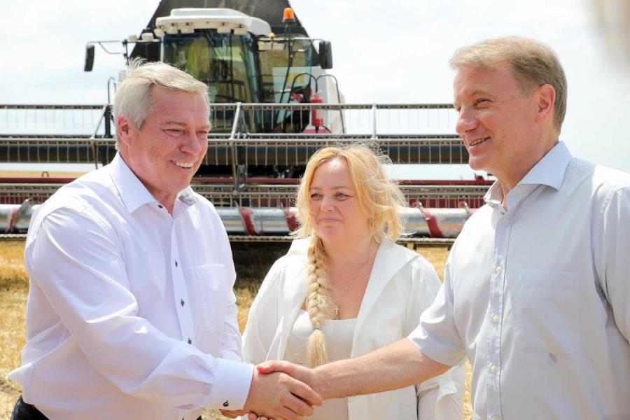 За демонстрацией уникальной техники на полях Октябрьского сельского района понаблюдали сегодня, 16 июля, президент, председатель правления ПАО Сбербанк Герман Греф и губернатор Ростовской области Василий Голубев.