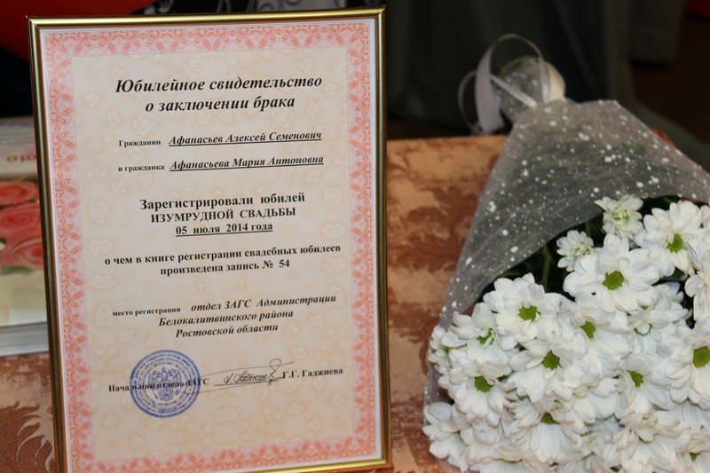 «Своим прочным многолетним союзом вы воплощаете высокие идеалы супружества: взаимную любовь, уважение и преданность»,- подчеркнула начальник отдела ЗАГС Администрации района Галина Гаджиева и поздравила с 55-летием совместной жизни Алексея Семеновича и Марию Антоновну.