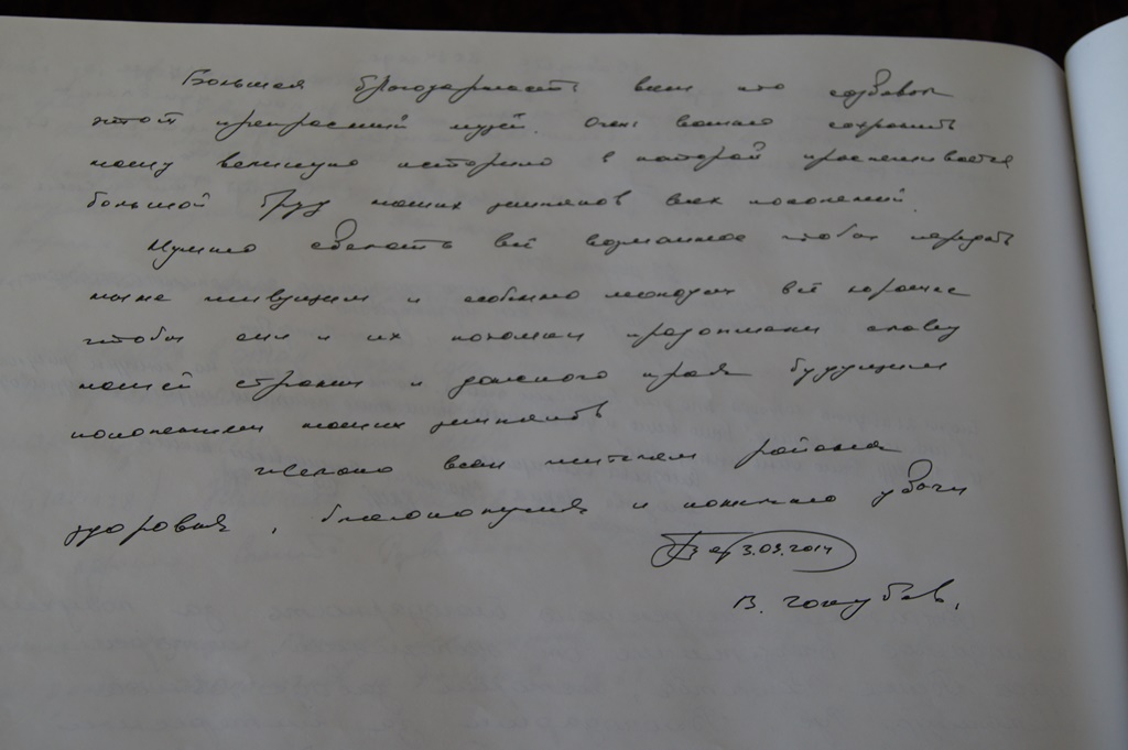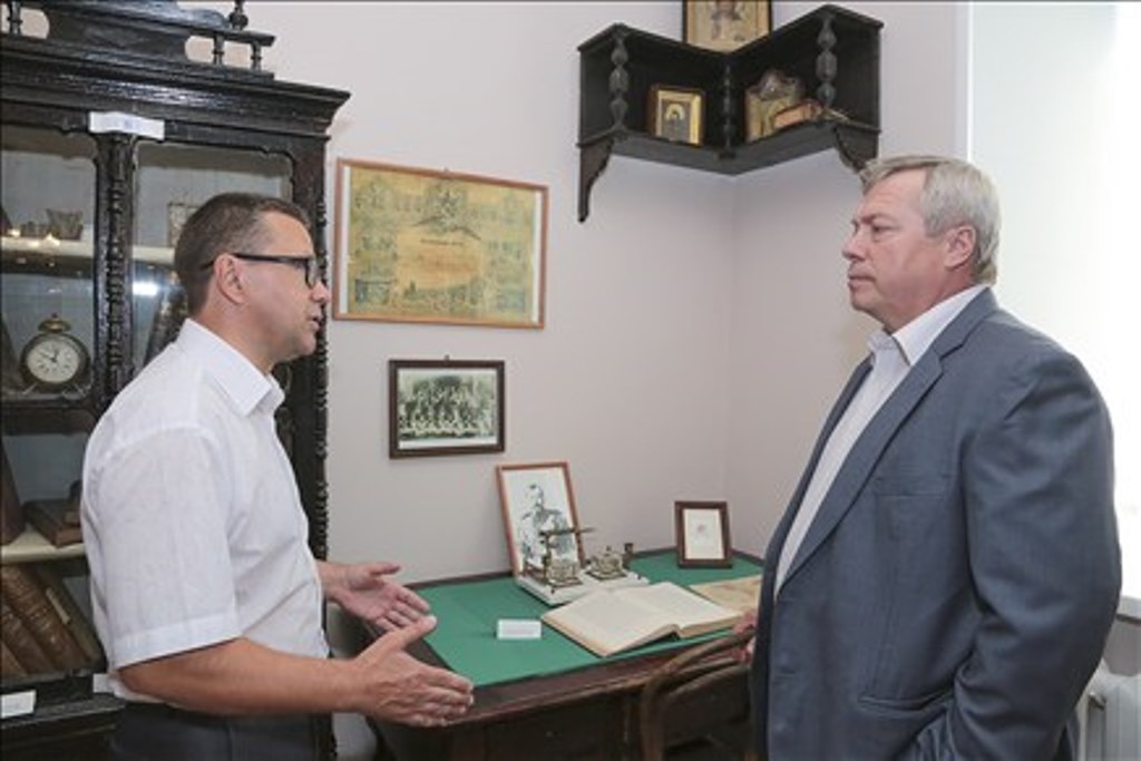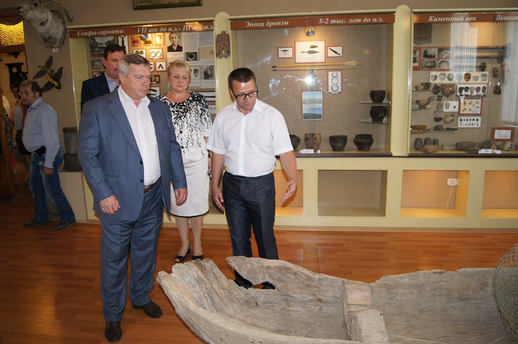 Василий Голубев и Ольга Мельникова начали осмотр объектов с посещения Белокалитвинского историко-краеведческого музея. Во время экскурсии, проведенной директором музея Валентином Хлебновым, почетные гости ознакомились с представленными экспозициями. С большим интересом Василий Юрьевич осмотрел экспонаты витрины «Славяне и половцы» и вспомнил добрым словом своего учителя истории П.И. Ковешникова, рассказал о том, как был участником митинга при открытии памятника героям «Слова о полку Игореве» на Караул-горе весной 1970 года. После завершения экскурсии, Губернатор поблагодарил сотрудников музея за работу, оставив свой отзыв в книге почетных посетителей.