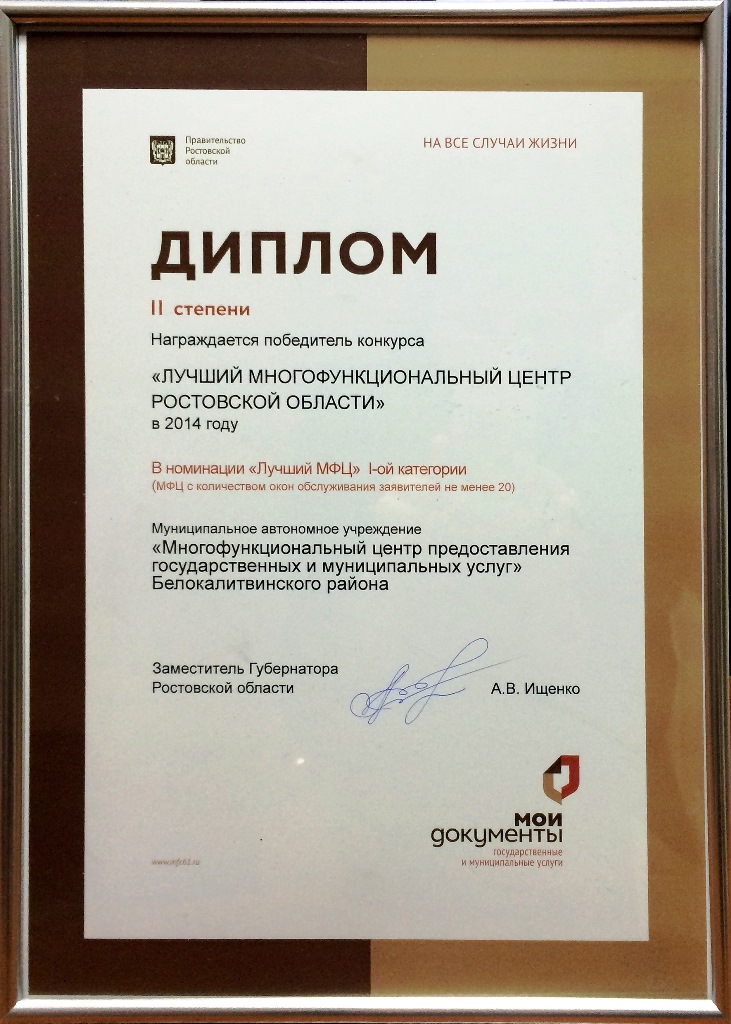 Приятно отметить, что МФЦ Белокалитвинского района отмечен Дипломом II степени в конкурсе «Лучший многофункциональный центр Ростовской области» в 2014 году. За активную работу по развитию сети многофункциональных центров предоставления государственных и муниципальных услуг в Ростовской области -Николаю Мищенко, директору МФЦ Белокалитвинского района, было вручено благодарственное письмо Губернатора Ростовской области, начальнику отдела электронно-информационного обеспечения Евгению Свинареву - благодарственное письмо министра информационных технологий и связи Ростовской области.