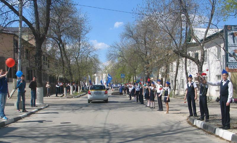 Областной автопробег, посвященный 70-летию Великой Победе, прибыл в Белую Калитву 27 апреля в 14.00 часов. Живым ярким коридором на улице Коммунистической школьники и студенты, приветствовали колонну воздушными шарами, флажками и лентам триколора.