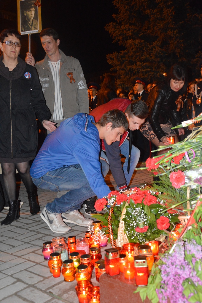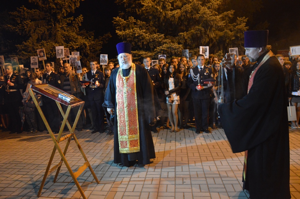 Массовая акция посвященная 70-летию Великой Победы состоялась в городе Белая Калитва, в ней приняли участие более 2 тысяч человек На площади перед Дворцом культуры вначале мероприятия состоялось коллективное исполнение песни «На Безымянной высоте». Затем участники акции, с зажженной свечой в руках прошли от Дворца Культуры к Площади Металлургов. Школьники несли фотографии своих дедов и прадедов- участников Великой Отечественной Войны. У памятника Неизвестному Солдату была отслужена лития об упокоении погибших защитников Отечества.