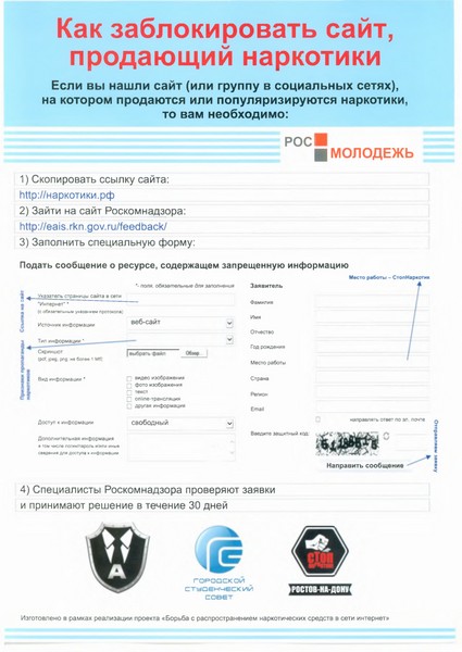 В целях пресечения распространения информации о продаже наркотиков и иных запрещенных к обороту психоактивных веществ участниками проекта «Борьба с распространением наркотиков по сети Интернет» и при содействии УФСКН России по Ростовской области разработана специальная памятка, доступно объясняющая, как заблокировать сайт, содержащий информацию о продаже наркотиков, либо популяризующий их.