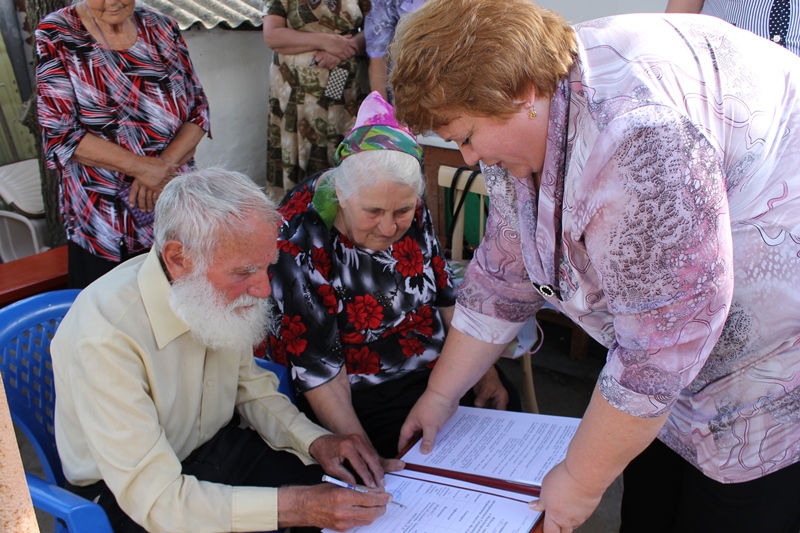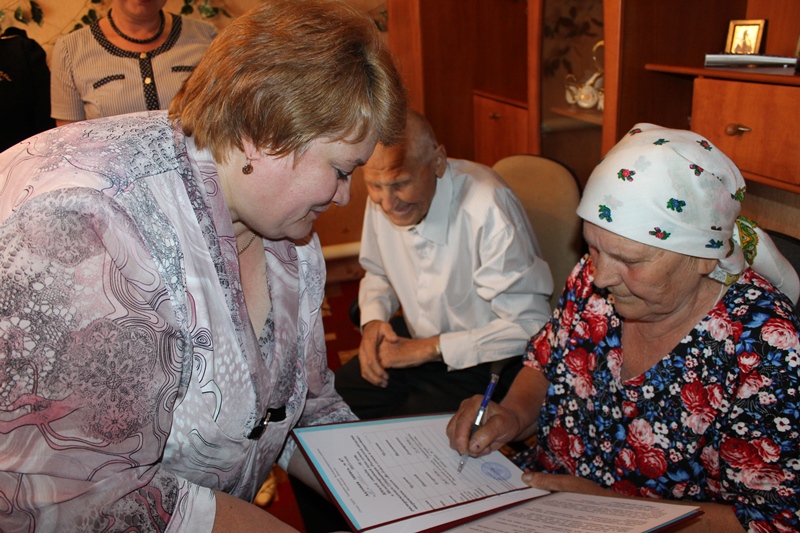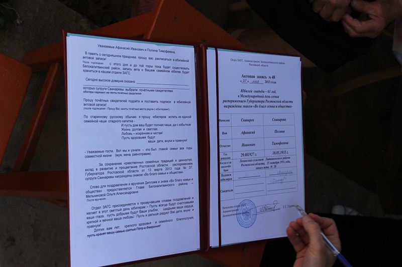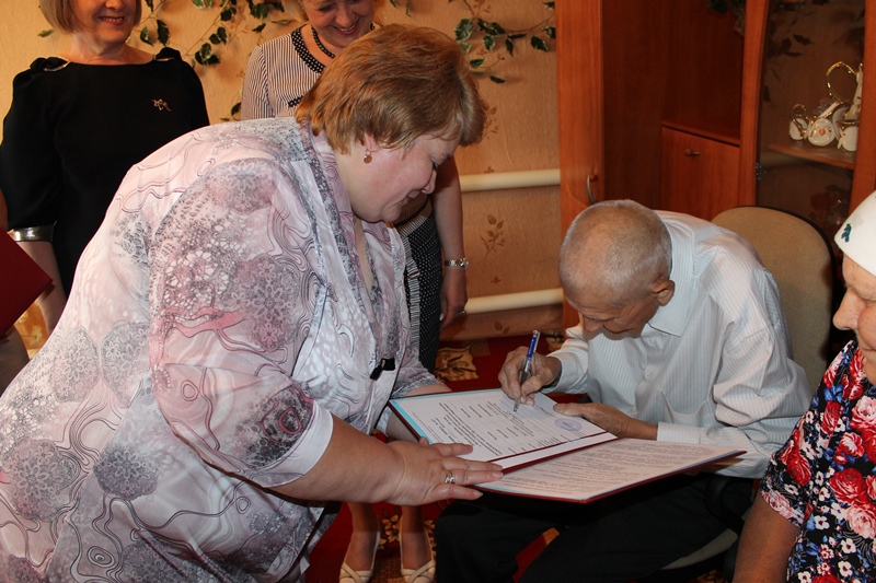 Начальник Отдела ЗАГС Галина Гаджиева провела торжественные церемонии регистрации 61-го года совместной жизни супругов Свинаревых и 58-ми лет совместной жизни супругов Чугуновых. Супруги обоих семей скрепили союзы подписями в актовой записи в книге свадебных юбилеев, а их свидетелями стали внуки, поставившие также свои подписи в юбилейной книге.