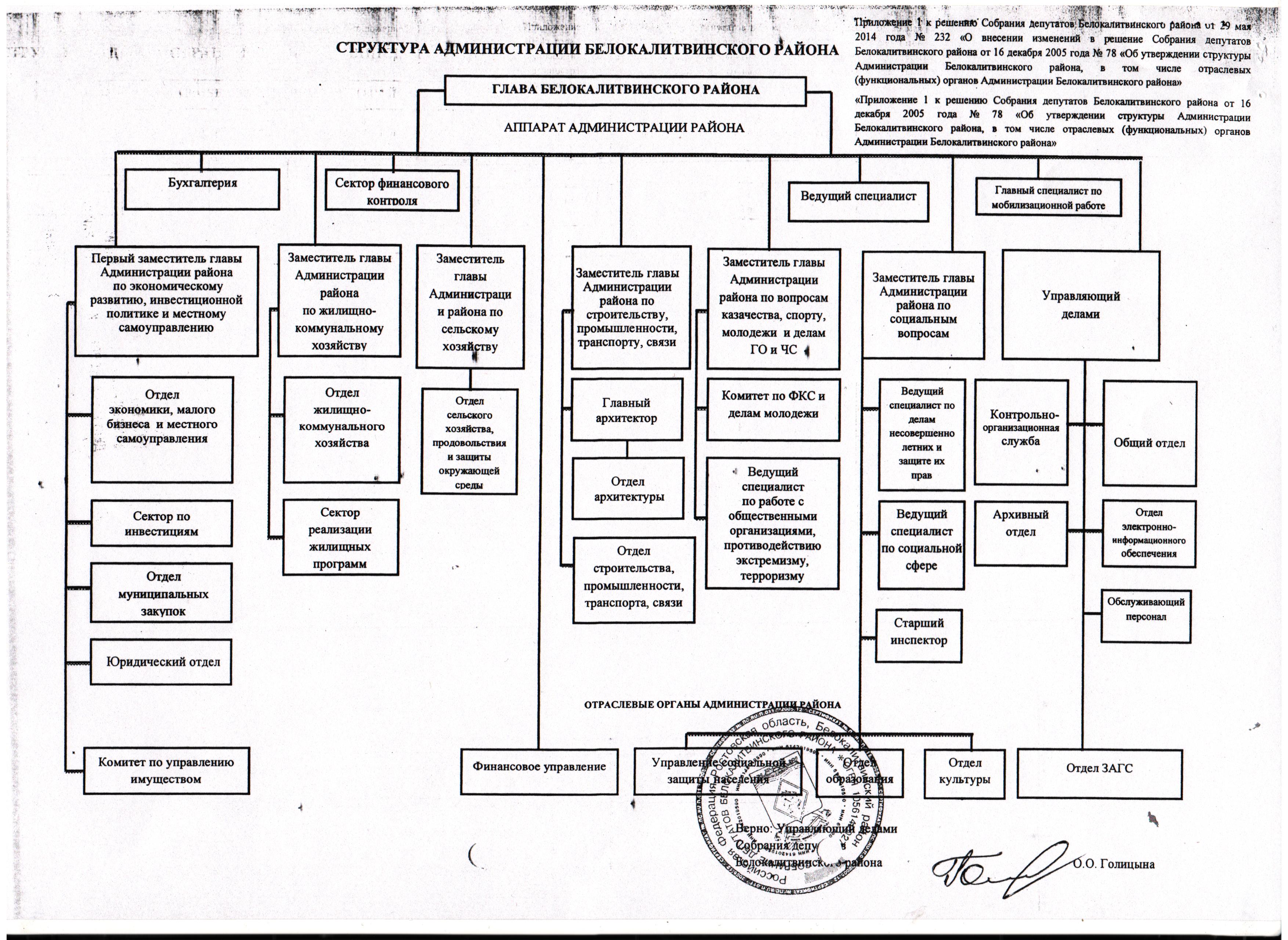 Приложение 1 к решению Собрания депутатов Белокалитвинского района от 29 мая 2014 года № 232 «О внесении изменений в решение Собрания депутатов Белокалитвинского района от 16 декабря 2005 года № 78 «Об утверждении структуры Администрации Белокалитвинского района, в том числе отраслевых (функциональных) органов Администрации Белокалитвинского района»