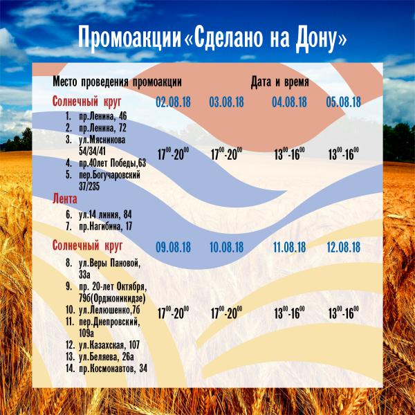 Приглашаем вас в г. Ростов-на-Дону на презентацию бренда «Сделано на Дону»! Вы сможете узнать подробнее о системе добровольной сертификации «Сделано на Дону», приобрести качественную донскую продукцию, а также получить подарки! Локации и время проведения акций смотрите здесь
