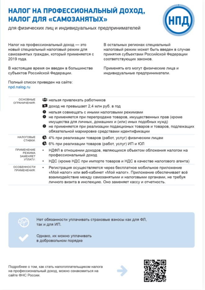 Применять специальный налоговый режим «Налог на профессиональный доход» могут физические лица (граждане России и других государств ЕАЭС), а также индивидуальные предприниматели, не имеющие наемных работников по трудовому договору. Они могут осуществлять реализацию собственных товаров (работ, услуг, имущественных прав), местом ведения деятельности которых является территория любого из субъектов Российской Федерации, включенных в эксперимент.
