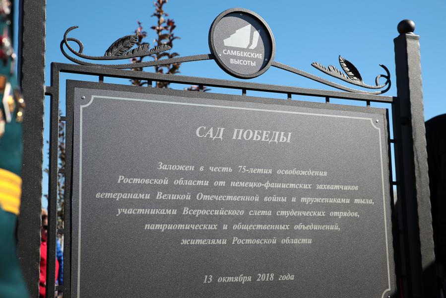 На территории строящегося народного военно-исторического музейного комплекса «Самбекские высоты» состоялась торжественная церемония закладки сада Победы. Губернатор Василий Голубев посадил в новом сквере дерево вишни. В честь каждого российского субъекта был высажен саженец. Высаженный сад Победы насчитывает почти 200 декоративных деревьев: вишни мелкопильчатой и яблони Недзвецкого.
