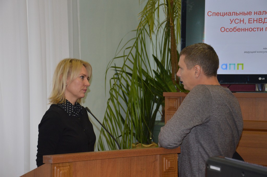 Вторая часть мероприятия представляла из себя два обучающих блока. На одном из которых прошел семинар «Специальные налоговые режимы. УСН, ЕНВД, патент. Особенности применения».