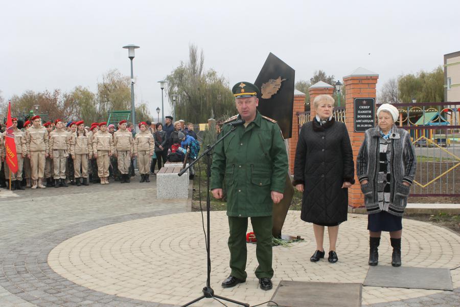 Перед собравшимися выступили командир 11-ой отдельной гвардейской инженерной бригады г. Каменск-Шахтинский, полковник Вооруженных сил Российской Федерации Дмитрий Марков и председатель Белокалитвинской районной организации «Союз ветеранов Афганистана» Александр Салов, которые выразили уверенность, что сквер станет местом, где будут проходить торжественные мероприятия, посвященные патриотическому воспитанию молодежи и встречи воинов-афганцев.