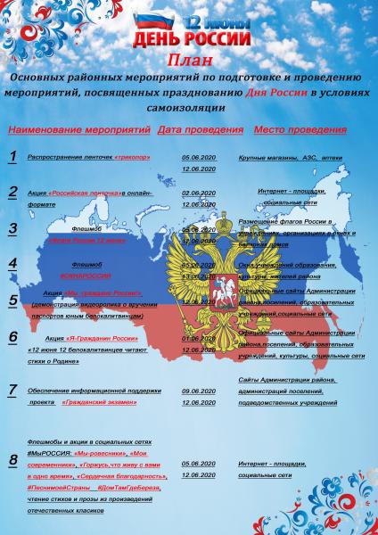 Соответствующий план основных районных мероприятий, посвященных празднованию Дня России в условиях самоизоляции, утвердила глава Администрации района Ольга Мельникова. «Поскольку введен запрет на проведение массовых мероприятий, мы решили провести День России с привлечением социальных сетей», - подчеркнула Ольга Мельникова.