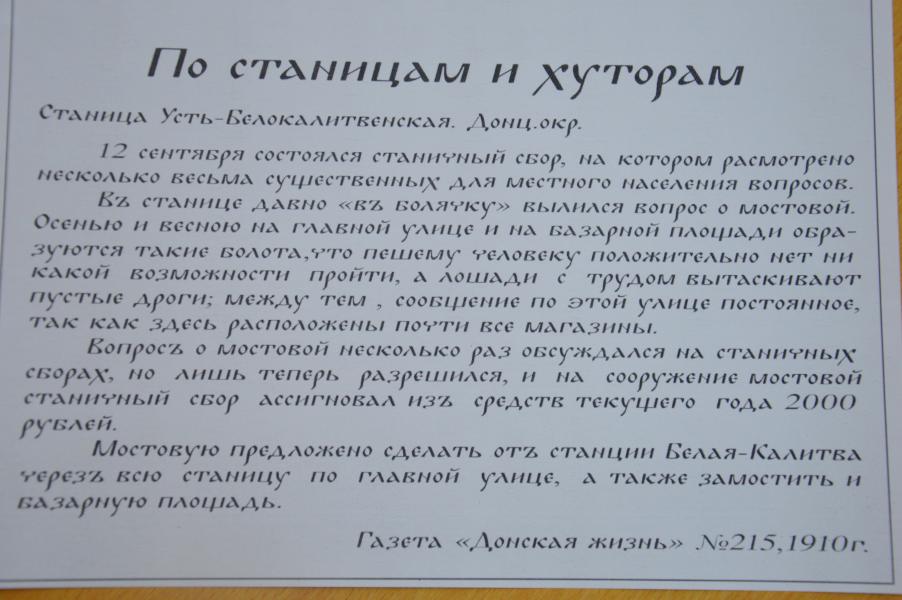 Глава Администрации Белокалитвинского поселения Сергей Сягайло проинформировал присутствующих, что во время реконструкции площади Майдан, при снятии верхнего слоя покрытия был обнаружен нижний исторический слой - брусчатка, которая, как позже выяснилось, была уложена в 1910 году. Прикоснуться к прошлому, почитать таблички с пояснением, сделать фото - это важный и яркий момент, поэтому участники совещания решили сохранить фрагмент старой брусчатки. Члены градостроительного совета определили, что брусчатка прошлого века будет сохранена вокруг макета карты станицы Усть-Белокалитвенской, где так же будет установлена таблица с исторической информацией. Вторым вопросом члены градостроительного совета обсуждали текст на входе в сквер «70 лет Победы». Решено в табличке отразить все этапы развития сквера, начиная с его закладки в 1984 году.