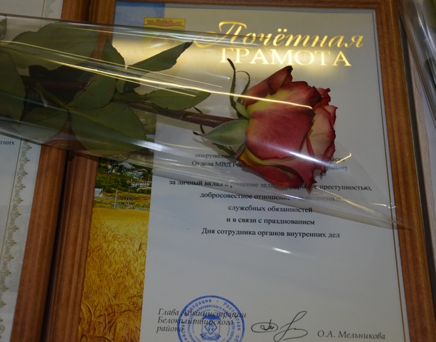 Сегодня, 10 ноября в профессиональный праздник -День сотрудника органов внутренних дел Российской Федерации белокалитвинские полицейские принимали поздравления от главы Администрации района Ольги Мельниковой. «В полиции нашего района служат профессионалы, которые ежедневно обеспечивают соблюдение законности, социальную и экономическую стабильность на белокалитвинской земле», - подчеркнула Ольга Мельникова и вручила Почетные грамоты и Благодарственные письма за добросовестную работу и верность долгу.