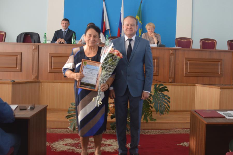 Заседание началось с поздравления с юбилеем самого старшего депутата Сологуб К.П.